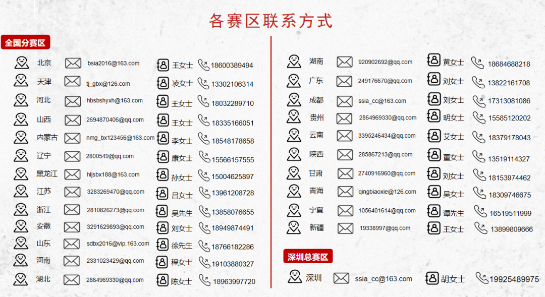 伍 报名方式 ●投稿作品均采用网上提交形式,无需打印作品,每件作品直接发送至指定邮箱即可报名;大赛不收取任何参赛费用; 报名邮件格式: 1.邮件标题:“公司名称/个人姓名+类别+作品名称”,作品名称需为系统标识工程项目实际名称(与合同中的标识工程项目名称一致) 2.邮件附件:①报名表 ②标识工程项目作品 报名细则: 1,报名表需自行前往www.ssia.cc网址下载或联系深标协秘书处; 2,每份作品须报名表、项目作品文件各每份作品须报名表、项目作品文件各1份,否则不予接收; 3,同一单位提交多个作品的,需要按单套作品进行分次提交; 4,若当地不设置分赛区,可投稿至深圳分赛区指定邮箱:ssia_cc@163.com;当地设置分赛区,误提交至深圳分赛区的作品,将返送至分赛区进行入围评选。