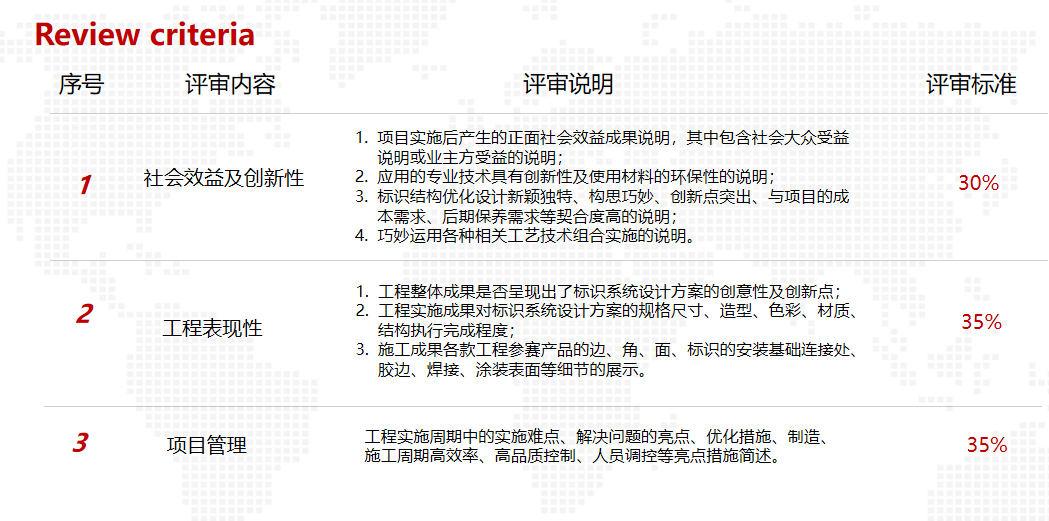 壹 参赛分类 比赛面向全国标识企业及标识单位主体,共分为七大类。 ●公共服务类(含城市道路、机场、车站、码头、展馆、体育馆、图书馆、博物馆、文化中心、活动中心、文化馆、市政公园等); ●综合体类(含商业综合体、文化综合体、产业综合体等); ●医疗、教育系统类; ●旅游园区、景区类; ●住宅、写字楼、产业园区、招商中心类; ●酒店类; ●商场、商业街区类; 投稿Tips: ①同一工程的标识产品,只能选择参加“标识产品大赛”或者“标识工程大赛”中的一项比赛。 ②投稿需为环境空间标识系统工程项目,单件标识作品、商标标志(Logo)、产品标签、工程广告围挡、各类广告旗帜、环境设备美化及围挡、公共设施构筑物及元素(如公共汽车站台、保安亭、垃圾箱、公共座椅、路灯等)、雕塑等作品,不予接受。 贰 评选说明 ●标识工程大赛采用分赛区单独评选赛制,各赛区评委由当地协会自行组织,再由各分赛区组织评选会评选出相应奖项,并将结果报送至大赛总执委会; 分赛区评选将由标识行业协会监事会全程监督全部评选会过程,坚决保证公正、公开、透明。分赛区评选结果将作为分赛区最终结果,获奖作品再统一由深圳总赛区组委会进行评选,角逐最终大奖; 此种赛制更加因地制宜,各赛区可以根据每个区域的特性和行业发展情况,进行赛事竞技。 叁 奖项设置 标识工程金奖 1名/类/赛区 标识工程银奖 2名/类/赛区 标识工程铜奖 3名/类/赛区 肆 评分标准 ●点击图片查看大图