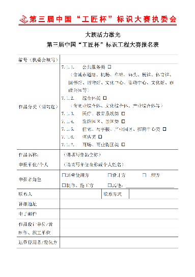 ▲报名表示意图 作品要求: 1.投稿作品格式要求:①存储格式:PDF格式;②页数:一个项目5个页面;③像素:300dpi;④单个图片大小不超过5M; 2.投稿作品内容要求:①详细的组织施工说明,项目实施难点、亮点,描述文字500字以内,与图片文档一起提交Word电子文档;②参赛项目导向标识设计效果图、同款标识施工图(结构设计图)、安装后实景照片、细节照片,不少于8张。一张主图,其他为辅助图; 3.投稿作品不得剽窃或抄袭他人作品,凡涉及著作、商标、署名权等知识产权和法律问题由参赛单位及个人负责。大赛执委会有权无偿使用获奖产品,并署名获奖单位名称进行推广;举办大赛获奖产品展览、公益巡展、出版及网络推广等活动 陆 全国各赛区联系方式 ●点击图片查看大图