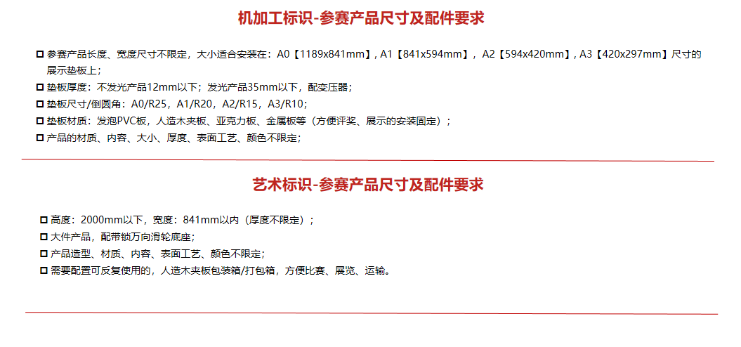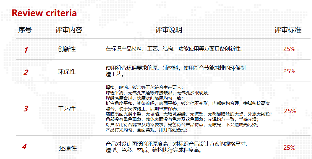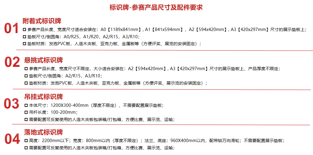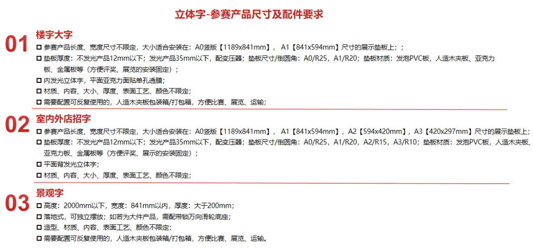 ▲往期标识展现场 ![]() ![]() 壹 参赛分类 标识产品大赛参赛作品共计分类4大类、21类;分类以主要材料作为分类依据,可搭配其他材料; 分类一、标识牌 ①附着式标识牌 附着式(单件)钣金 标识牌、附着式(单件)铝型材 标识牌、附着式(单件)亚克力 标识牌、附着式(单件)其他材料 标识牌、附着式(成套)标识牌、附着式(单件)酒店专用 标识牌、附着式(成套)酒店专用 标识牌; ②悬挑式标识牌 悬挑式(单件)钣金标识牌、悬挑式(单件)铝型材标识牌、悬挑式(单件)其他材料标识牌; ③吊挂式标识牌 吊挂式(单件)钣金 标识牌、吊挂式(单件)铝型材 标识牌、吊挂式(单件)其他材料 标识牌; ④落地式标识牌 落地式(单件)钣金 标识牌、落地式(单件)铝型材 标识牌、落地式(单件)其他材料 标识牌; 分类二、立体字 ①楼宇大字; ②室内外店招字; ③景观字; 分类三、机加工标识 铜、铝、亚克力、木材、石材等CNC、雕刻加工产品; 分类四、艺术标识 城市家具、景观小品、艺术雕塑、公共装置等产品; ![]() 贰 参赛作品要求