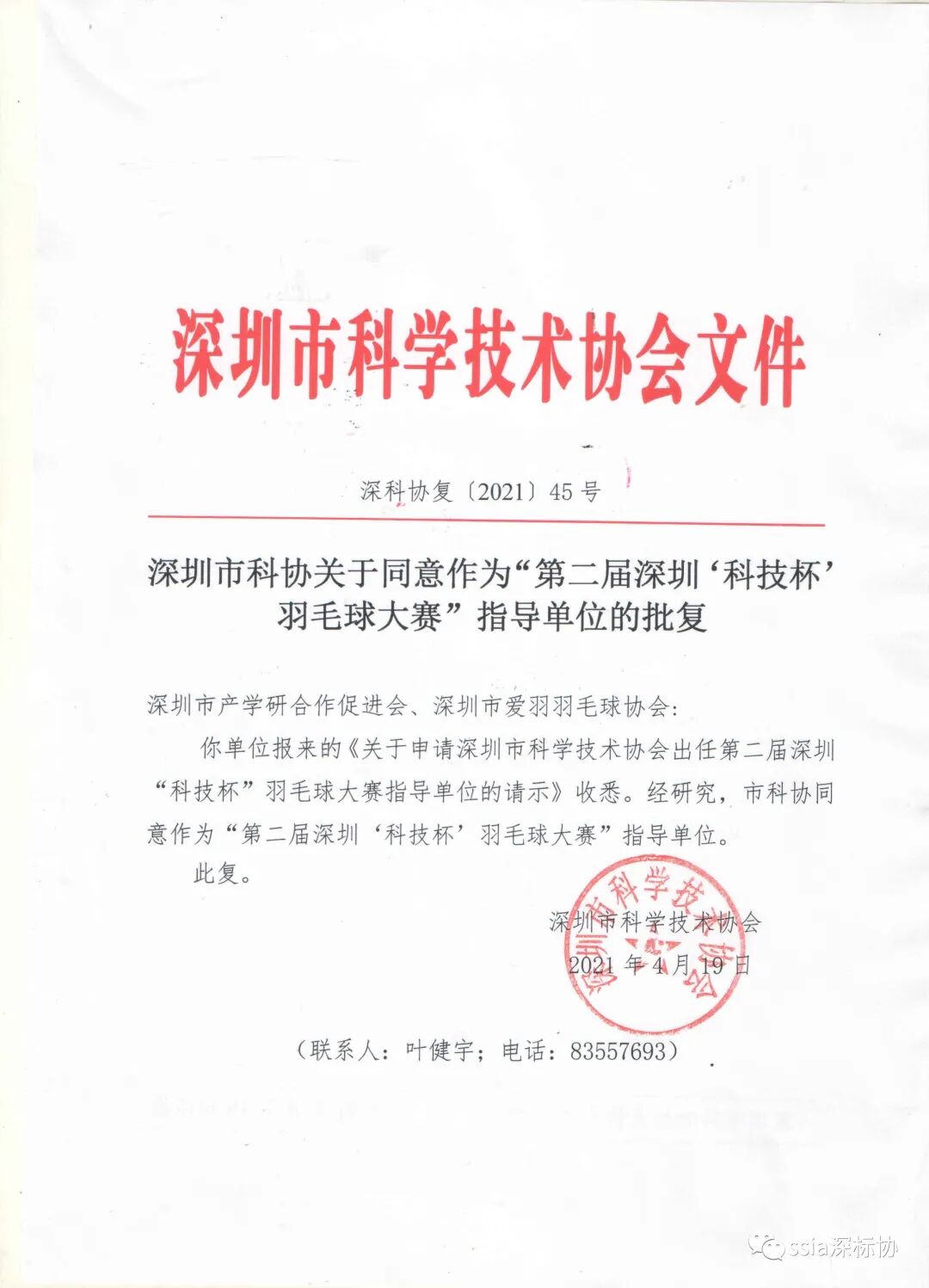 2021第二届深圳“科技杯”羽毛球大赛报名正式启动! 深圳市标识行业协会作为联合主办单位之一,组队参加本次赛事,欢迎各会员单位踊跃报名组队,积极参与 。 深标协队: 报名联系人:谢嘉穗 电话:0755-86002268 参与人数:限12人 ,男运动员不能低于7名,女运动员不得低于2名。